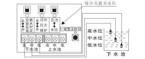 設(shè)置空載保護(hù)后,下水池不能接探頭。上水池的水用到中水位時會開始抽水,抽到高水位會水滿停機(jī),低水位訊號線起回路作用。