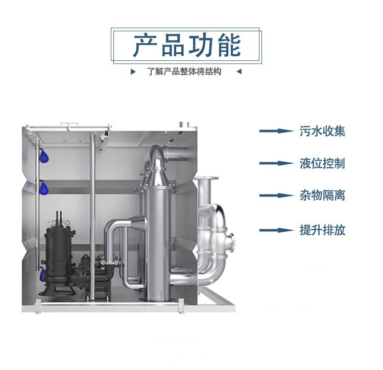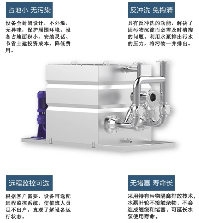 3、固液分離反沖洗型:可以?xún)?nèi)外置(污水提升設(shè)備進(jìn)水前端2套固液分離器,分離進(jìn)水前端液體,通過(guò)集污箱液體反沖出至管道抽排至地上污水井內(nèi)。