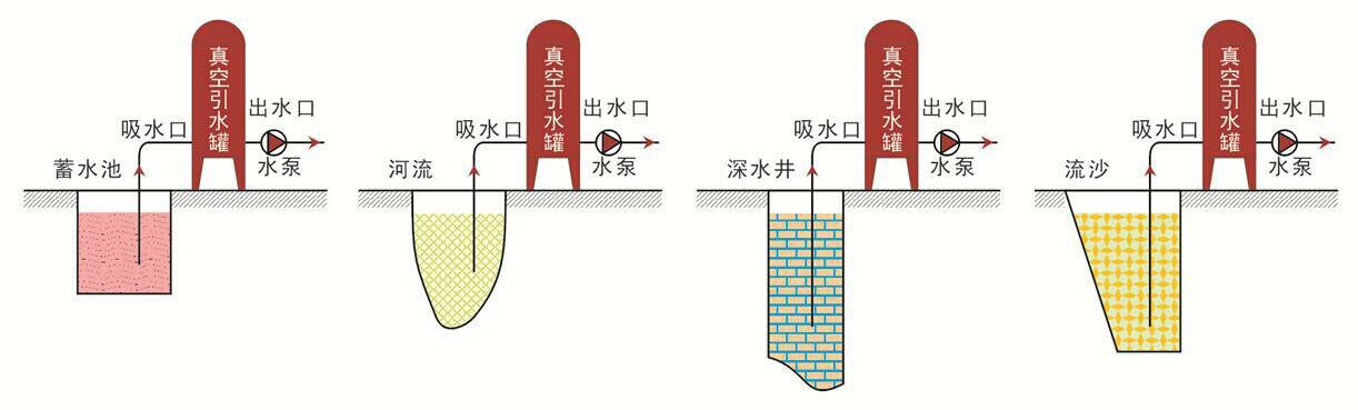 使用前真空罐內(nèi)須加滿水,當(dāng)罐內(nèi)的水被水泵吸出,罐內(nèi)產(chǎn)生負(fù)壓(真空)后,由于大氣壓的作用,蓄水池內(nèi)的水通過(guò)吸水管進(jìn)入真空罐,通過(guò)水泵源源不斷的供水。